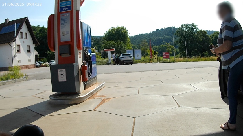 Als wir wenige Minuten später durch Fischbach fuhren, fiel mir auf, dass der Nissan vor der Esso-Tankstelle steht. Die Fahrerin kam gerade aus dem Verkaufsraum und war dabei, sich in ihr Auto zu setzen. Ich fragte sie, ob sie Deutsch könne und sprach sie auf ihre Aktion an, indem ich ihr mit beiden Händen den Abstand zeigte und fragte, ob es noch gehen würde. Sie meinte nur, wir seien „so gefahren“ und deutete mit den Händen ein Schwanken an.
