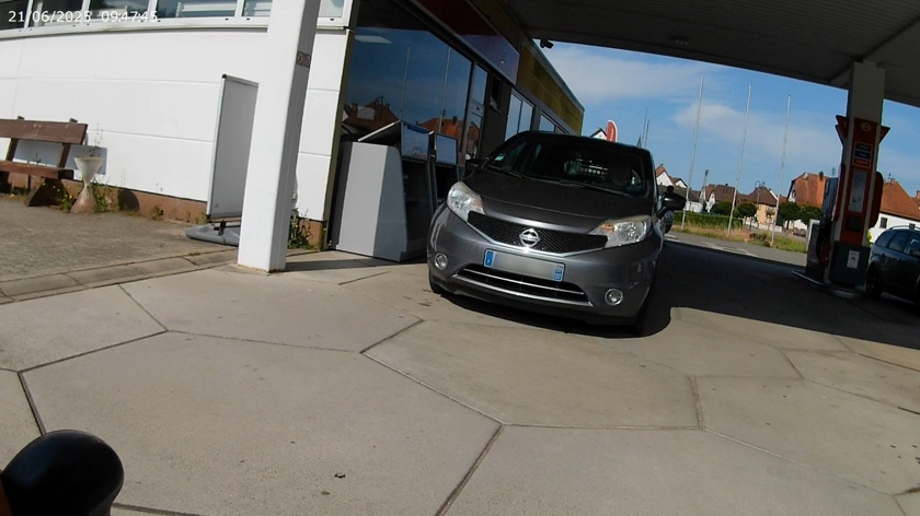Nun hatte ich aber – Siehe das Standbild aus meiner Anzeige – ja bei meiner Einfahrt in das Örtchen Fischbach bemerkt, dass der graue Nissan, der uns keine vier Minuten zuvor auf eine gemeingefährliche Weise rasiert hatte, an der Tankstelle stand. Leider war mein Kumpel mal wieder zu döskappig, um mir zu folgen, sondern blieb vorne an der Einfahrt zur Tanke stehen. Ich konnte die alte, der deutschen Sprache mächtige Französin daher filmen und auch auf ihre Nötigung ansprechen.