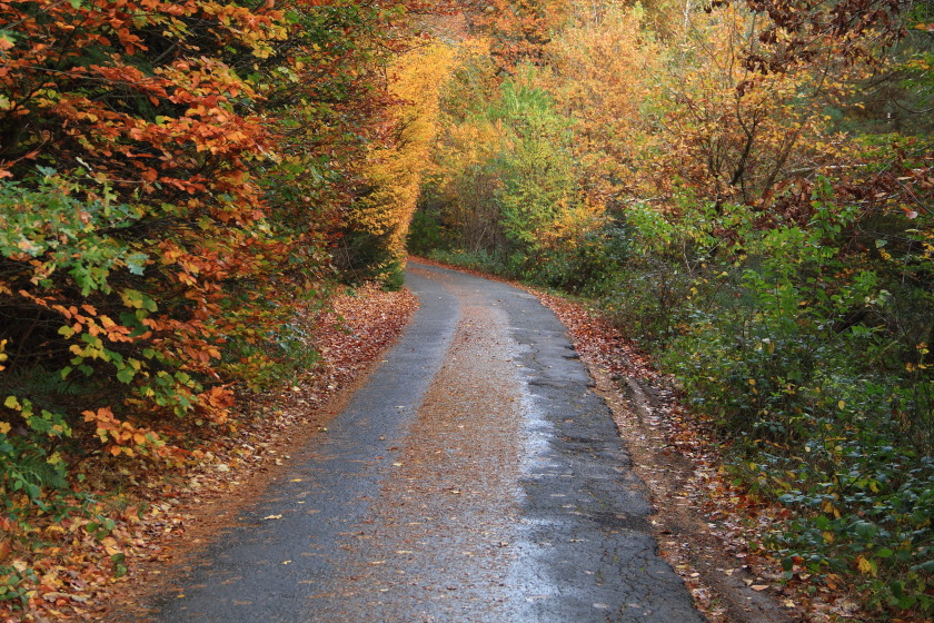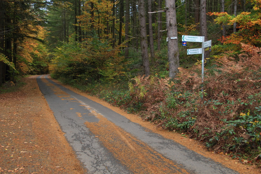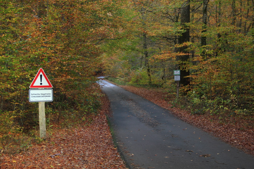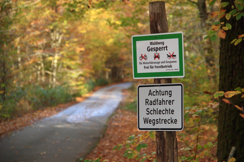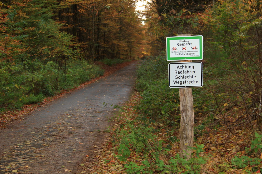 Es gibt Neuigkeiten zum Schleichweg zur Bremendell. Da es heute nach einer komplett durchnässten Woche endlich mal wieder über den Nachmittag trocken bleiben sollte, nutzte ich den Sonntag für eine klassische Runde mit dem Rennrad über den Braunsberg und die Eselsteige. Leider musste ich angesichts der winterlichen Temperaturen von um die 8 °C auch erstmals in dieser Saison in die lange Radhose und Winterjacke schlüpfen sowie die dicken Handschuhe aus dem Schrank kramen. Jedenfalls hatte ich auch noch die Spiegelreflexkamera mit in den Rucksack gepackt, um einen Abstecher zur Rumpelpiste zu machen und sie mal (auf der deutschen Seite) detailliert zu dokumentieren. Hierbei fiel mir auf, dass sich an der Beschilderung etwas nicht unmaßgebliches verändert hat.