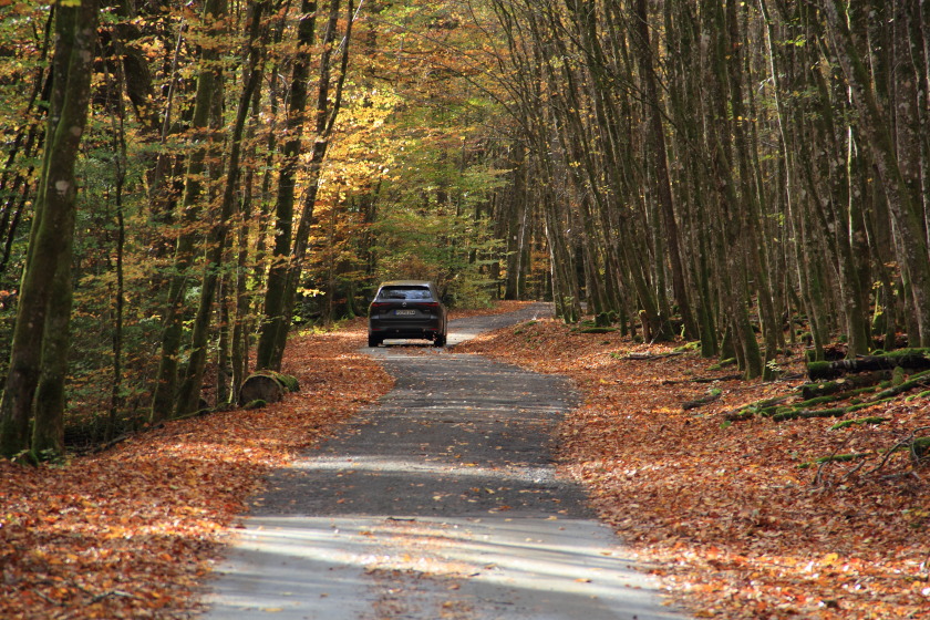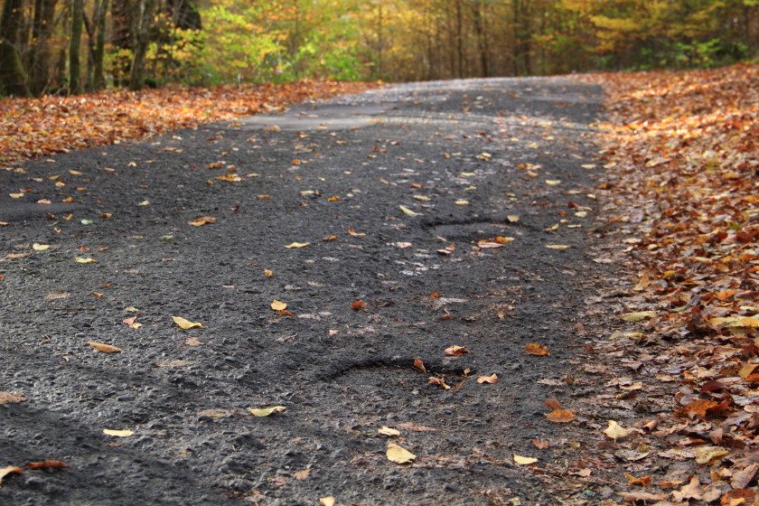 In Richtung des Abzweigs zur Rösselsquelle ist die Fahrbahn weiter sehr rau und löchrig.