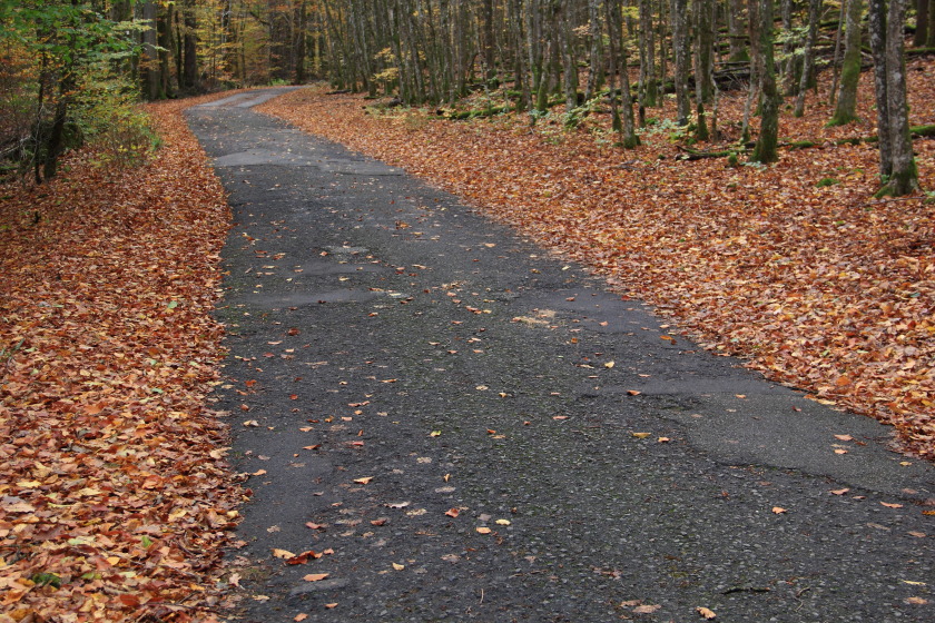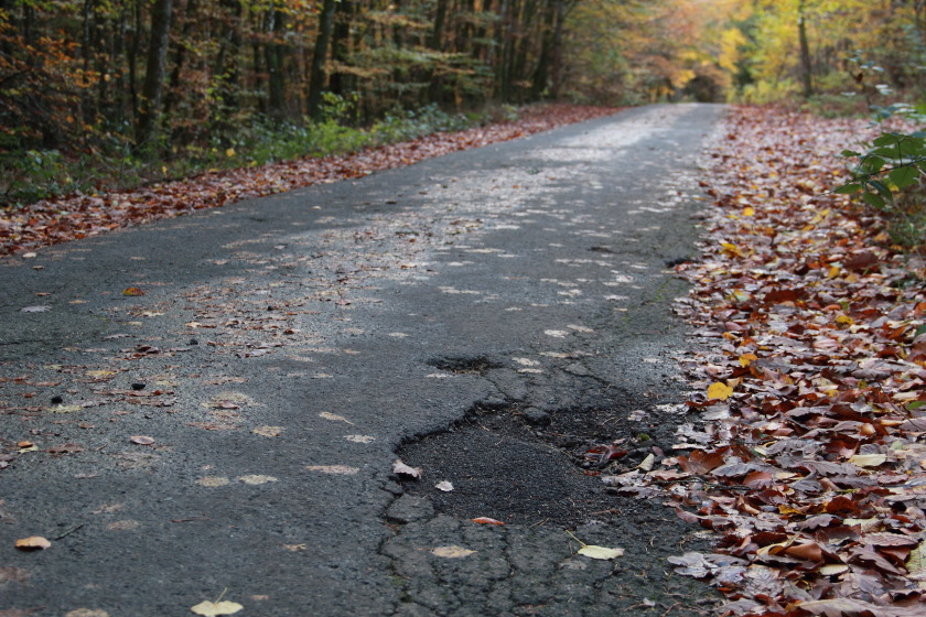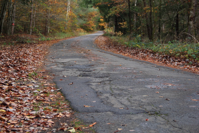 Fährt man von hier aus weiter in Richtung Ludwigswinkel, muss man insb. am brüchigen Fahrbahnrand besonders vorsichtig sein. Außerdem sieht man aufgrund des starken Bewuchses am Wegesrand wenig bis gar nichts von dem, was hinter der Linkskurve auf einem zukommen könnte.