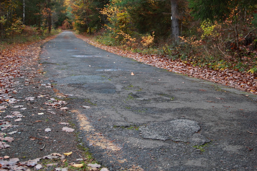 Der Asphaltbelag ist uralt. Die Deckschicht hat sich größtenteils aufgelöst. Vorhanden ist meist nur noch eine sehr raue Grundschicht, die an der ein oder anderen Stelle geflickt wurde.