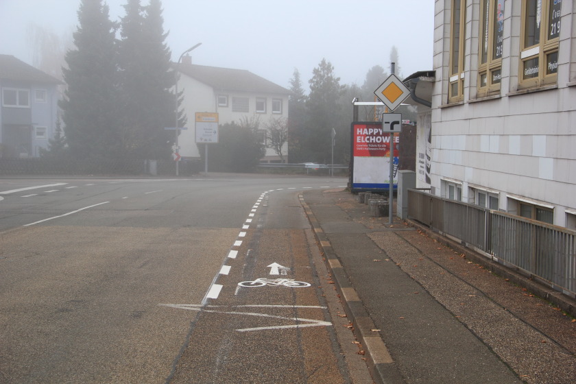 Der ehemalige Irgendwas-Streifen wurde nun also kurz hinter der Bushaltestelle vor der abknickenden Vorfahrt neu markiert. Diese neue Markierung wurde übrigens gerade in der Kurve während meines kurzen Fotostops genauso übel von zahlreichen Autofahrern geschnitten wie die alte; sie dürfte daher auch sehr schnell wieder weggerubbelt sein. Im Übrigen scheint die Markierung auch nicht dem zu entsprechen, was in den ERA 2010 hierüber geschrieben steht, denn die einzelnen Schmalstriche sollen, wie auch die Lücken zwischen jenen, genau einen Meter lang sein. Dies scheint mir jedenfalls bereits am Beginn der neuen Markierung nicht der Fall zu sein.