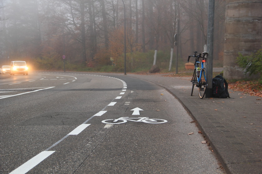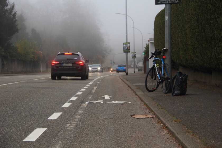 Das wäre auf jeden Fall, hätte er nicht die durchgezogene Linie bzw. die Sperrfläche überfahren, sehr „kuschelig“ geworden. Wie das halt so ist, im Zuge „fahrradfreundlicher Stellen“ in Pirmasens. Deren Verwaltung also auch hier Kraftfahrzeugnutzer mittels einer überflüssigen und kontraproduktiven Markierung eines „Schutzstreifens“ zum vorsätzlichen Rechtsbruch motiviert.