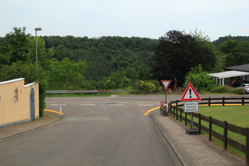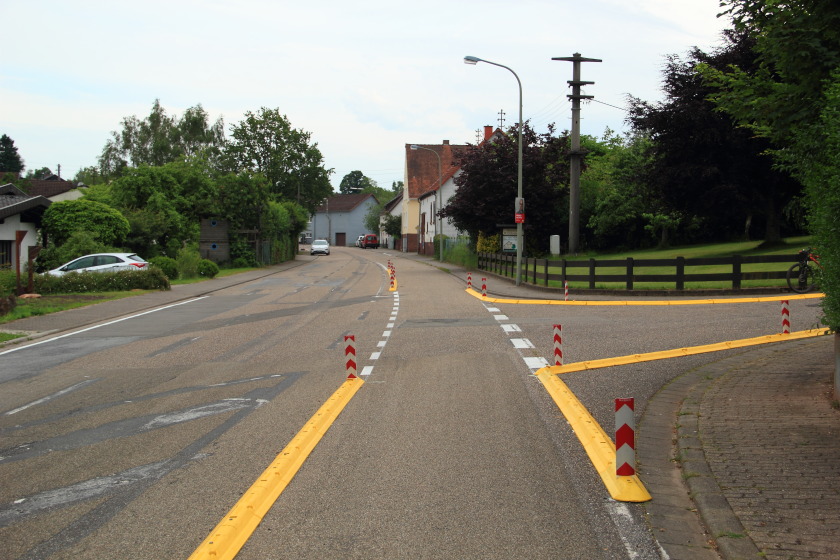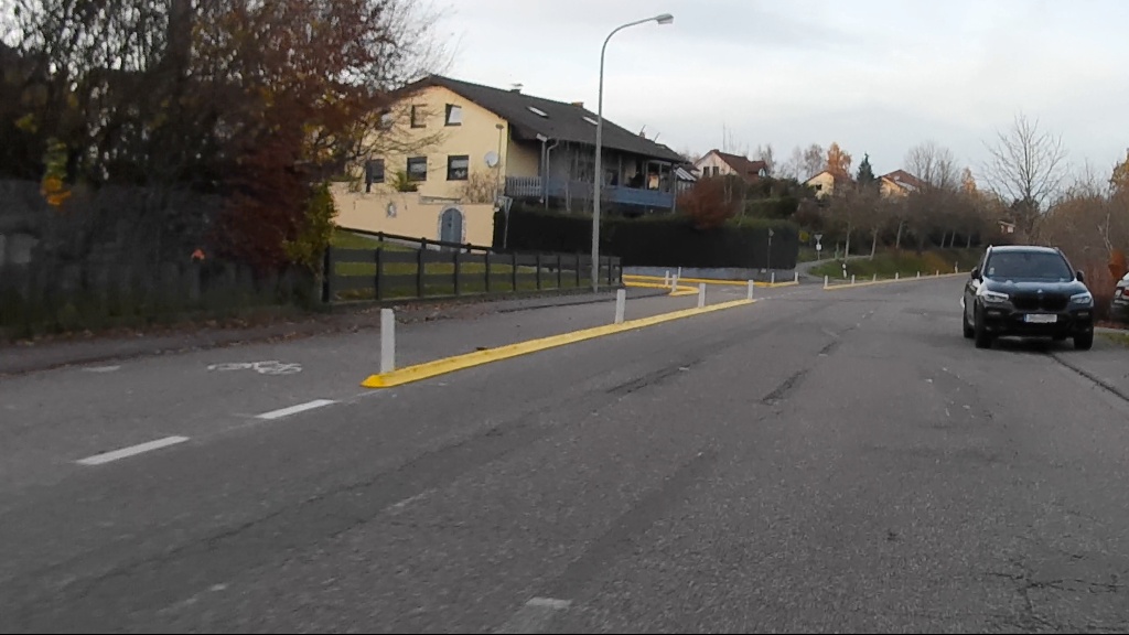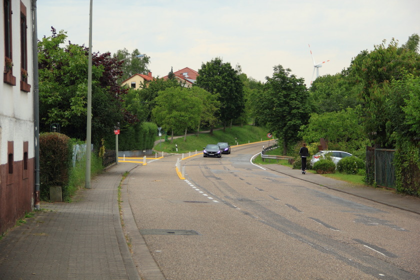 Schauen wir uns also einfach mal an, was dort im Frühjahr 2024 verbrochen wurde. Vermutlich von der Straßenverkehrsbehörde der Verbandsgemeinde Pirmasens-Land, die sich allerdings nur ein paar Meter weiter weiterhin beharrlich weigert, die RLP-Radroute (deren Teil übrigens auch der hier dokumentierte Abschnitt ist) für den Radverkehr freizugeben.