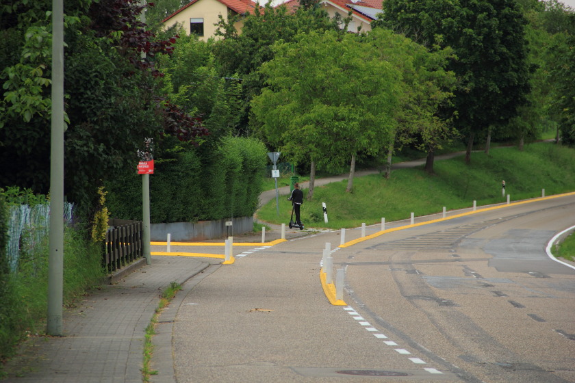 Eine junge E-Scooter-Fahrerin war jedenfalls an diesem grauen Juni-Tag so nett, uns gleich mal zu zeigen, wie es nicht geht. Denn sie befuhr zuerst den rechten Gehweg der Pirmasenser Straße in Richtung Felsenbrunnerhof.
